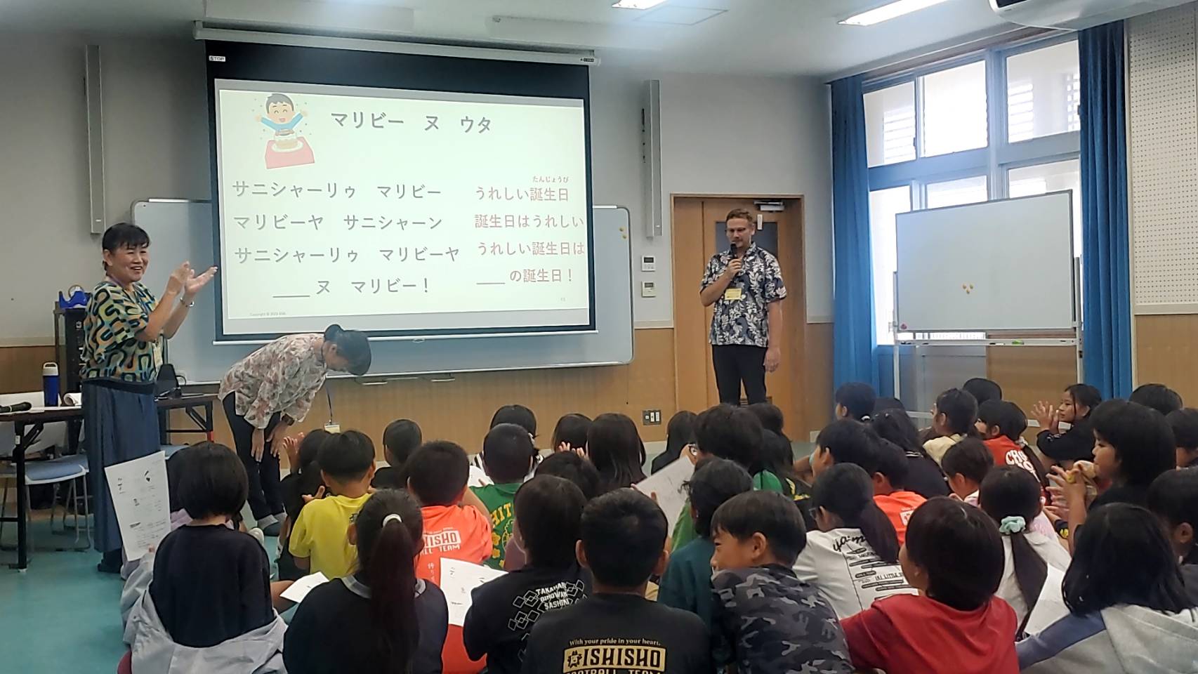 10月24日、石垣小学校で開催された「スマムニ」の授業に、ネイティブスピーカーの先生お二人と一緒に招かれ、参加してきました。対象は4年生2クラス、60名以上の子どもたちでした。また、翌日から始まる「方言サミット」(今年は10月25日・26日、石垣で開催)に関わる皆さんも、この特別授業を見学に来てくださいました。